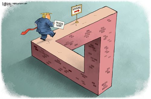 In the cartoon below Donald Trump goes by impossible triangle in an endless cycle of trade wars which he cannot win. Moreover he started real wars and also cannot stop them.