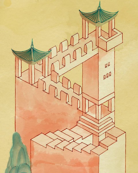 We see a fortress in Chinese style, which has form of impossible triangle. Also, there's endless staircase below the fortress.