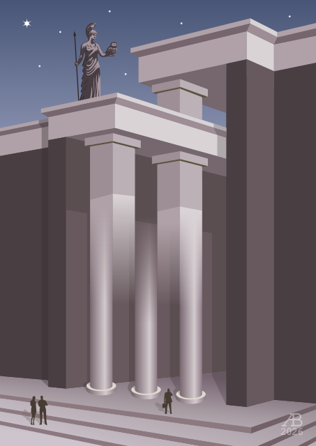 Картина вдохновлена фотографией входа в Музей Римской цивилизации (см. фото ниже). Колонны расположены одновременно в двух пересекающихся плоскостях. Более того, сверху - две квадратные колонны, а снизу - три круглые. Отношение к античной цивилизации подчеркивает скульптура Афины с совой на крыше здания.